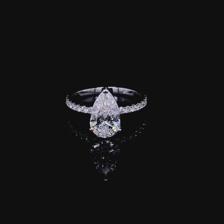 Featuring a stunning 2-carat pear-shaped diamond, this piece is enhanced by meticulously matched side diamonds that amplify its brilliance and depth. Designed with precision, the pear cut offers a distinctive silhouette that combines elegance with a modern edge, making it an exceptional choice for connoisseurs seeking both beauty and craftsmanship.