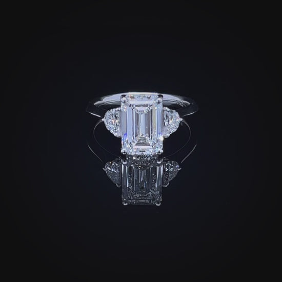 This 3 carat emerald trilogy features special moon cuts on the side, adding an elegant touch to the classic design. The unique cuts enhance the beauty and brilliance of the emerald stones, making this piece a timeless and sophisticated choice.