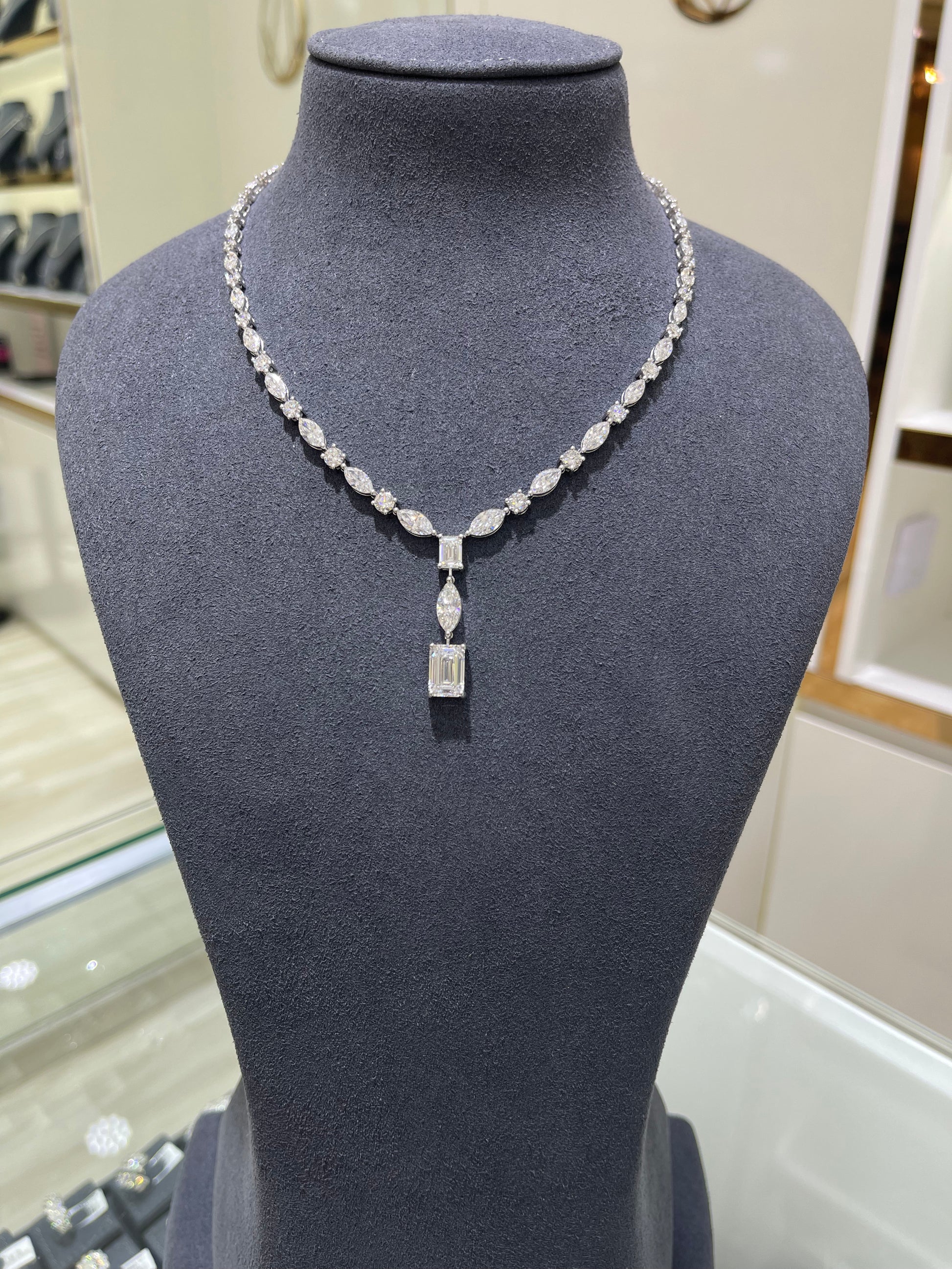 This refined necklace features a 4-carat emerald-cut diamond as its centerpiece, complemented by an array of mixed-shape diamonds that add depth and brilliance. The emerald cut emphasizes the diamond’s clarity and elegance, while the varied shapes create a dynamic and sophisticated design. Expertly crafted, this piece offers a timeless statement of luxury and precision.