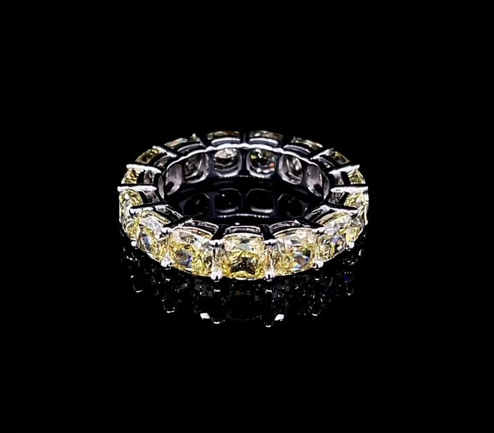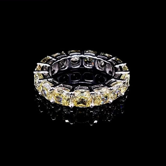 This 50-point cushion cut fancy yellow diamond eternity band features a continuous row of cushion cut diamonds, each selected for their vibrant yellow hue and exceptional clarity. Expertly crafted to ensure maximum brilliance and durability, this band offers a sophisticated and timeless expression of luxury, perfect for those seeking a distinctive and elegant piece.