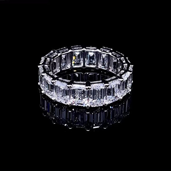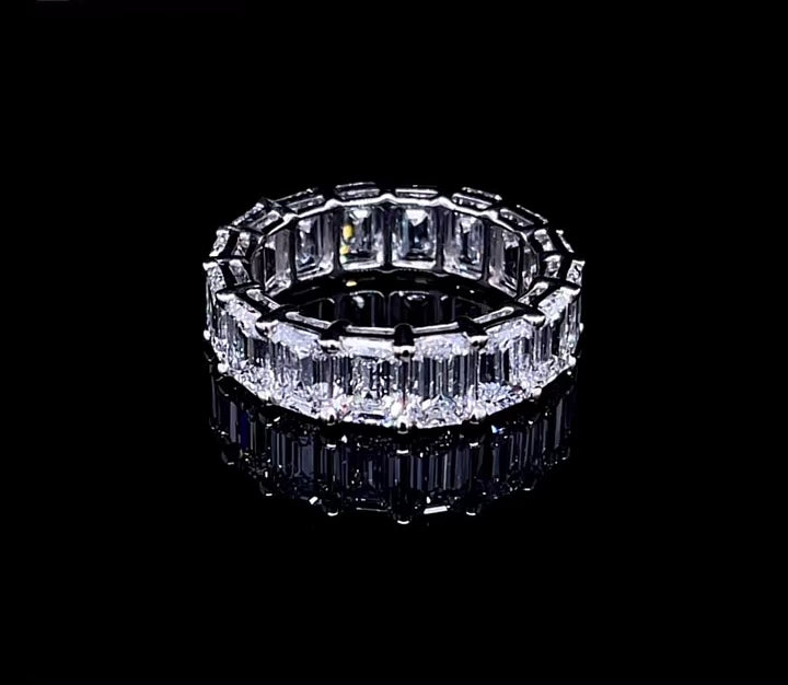 This 50-point emerald cut diamond full eternity band showcases precision-cut stones set continuously around the band, offering a seamless sparkle from every angle. Expertly crafted for durability and elegance, it provides a sophisticated and timeless accessory that complements any style with refined brilliance. Ideal for marking special occasions or enhancing everyday wear with understated luxury.