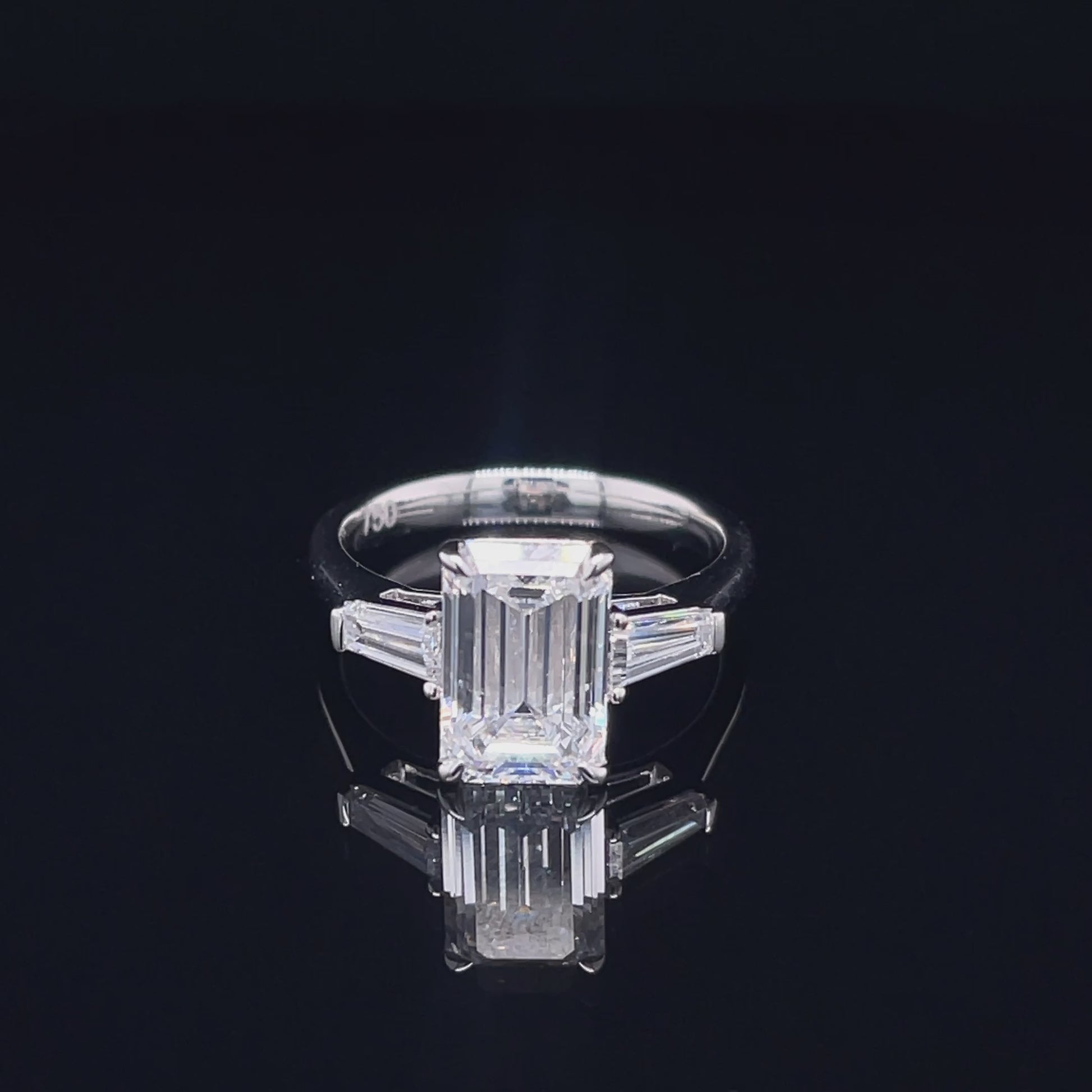 Striking in its simplicity and rich in brilliance, this exquisite ring features a 5-carat emerald-cut diamond at its center, celebrated for its clean lines and captivating hall-of-mirrors sparkle. Sleek baguette diamonds grace each side, perfectly framing the center stone and enhancing its architectural beauty. The balanced design highlights clarity, symmetry, and understated luxury, creating a ring that is both effortlessly sophisticated and eternally classic.