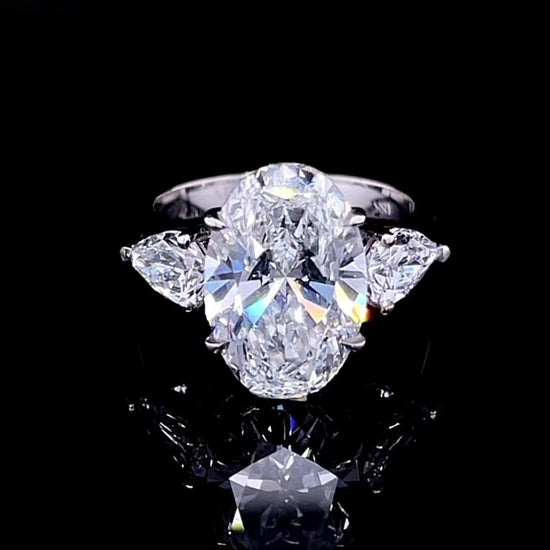 Introducing our exquisite 5CT Oval Trilogy Ring. Featuring a stunning 5CT oval center stone, complemented by two pear cut side stones, this ring is the epitome of elegance and sophistication. Expertly crafted with precision and care, this ring is sure to make a statement and leave a lasting impression. Experience the ultimate in luxury with our 5CT Oval Trilogy Ring.