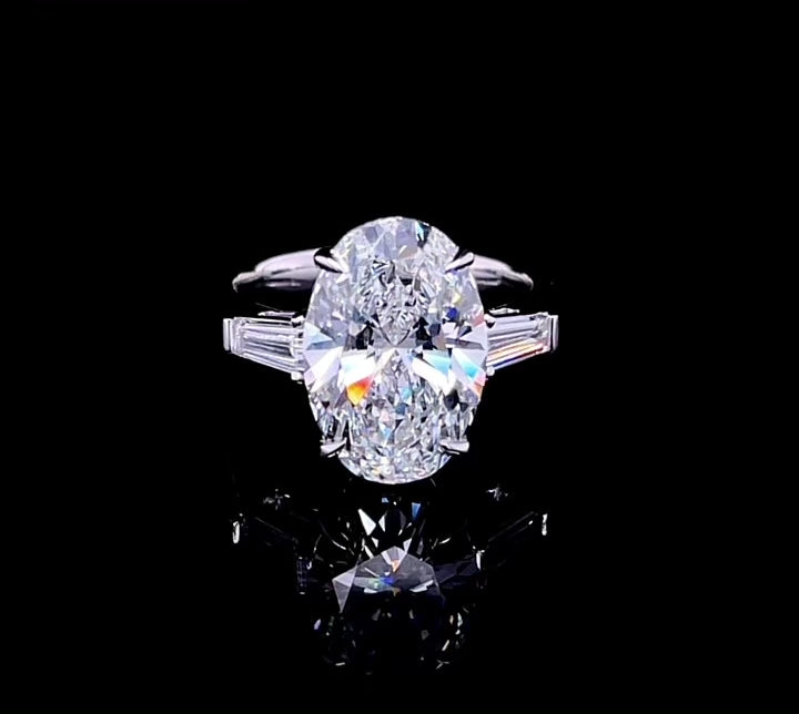 Expertly crafted, this 5CT oval ring with side baguette diamonds shines with elegance. The 5CT oval diamond, expertly cut and set in a sleek design, will make a stunning statement piece. The addition of the baguette diamonds on the sides adds a touch of unique detail, making this ring truly one-of-a-kind. Elevate your style with this exquisite ring.