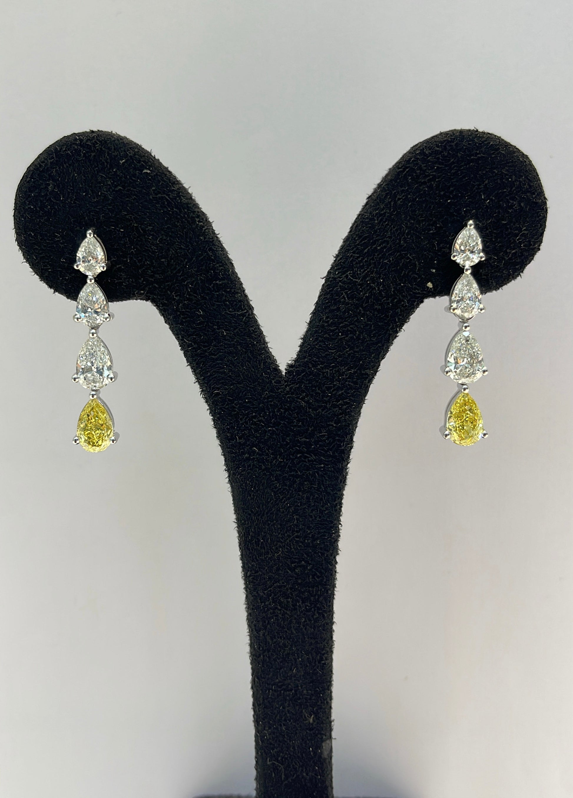 This elegant earring showcases a 0.70-carat pear-shaped fancy yellow diamond, accentuated by meticulously set white diamonds. Designed with expert craftsmanship, it highlights the vibrant hue and exceptional clarity of the yellow diamond, creating a striking contrast with the white diamonds. Perfect for connoisseurs seeking a sophisticated and distinctive addition to their fine jewelry collection.