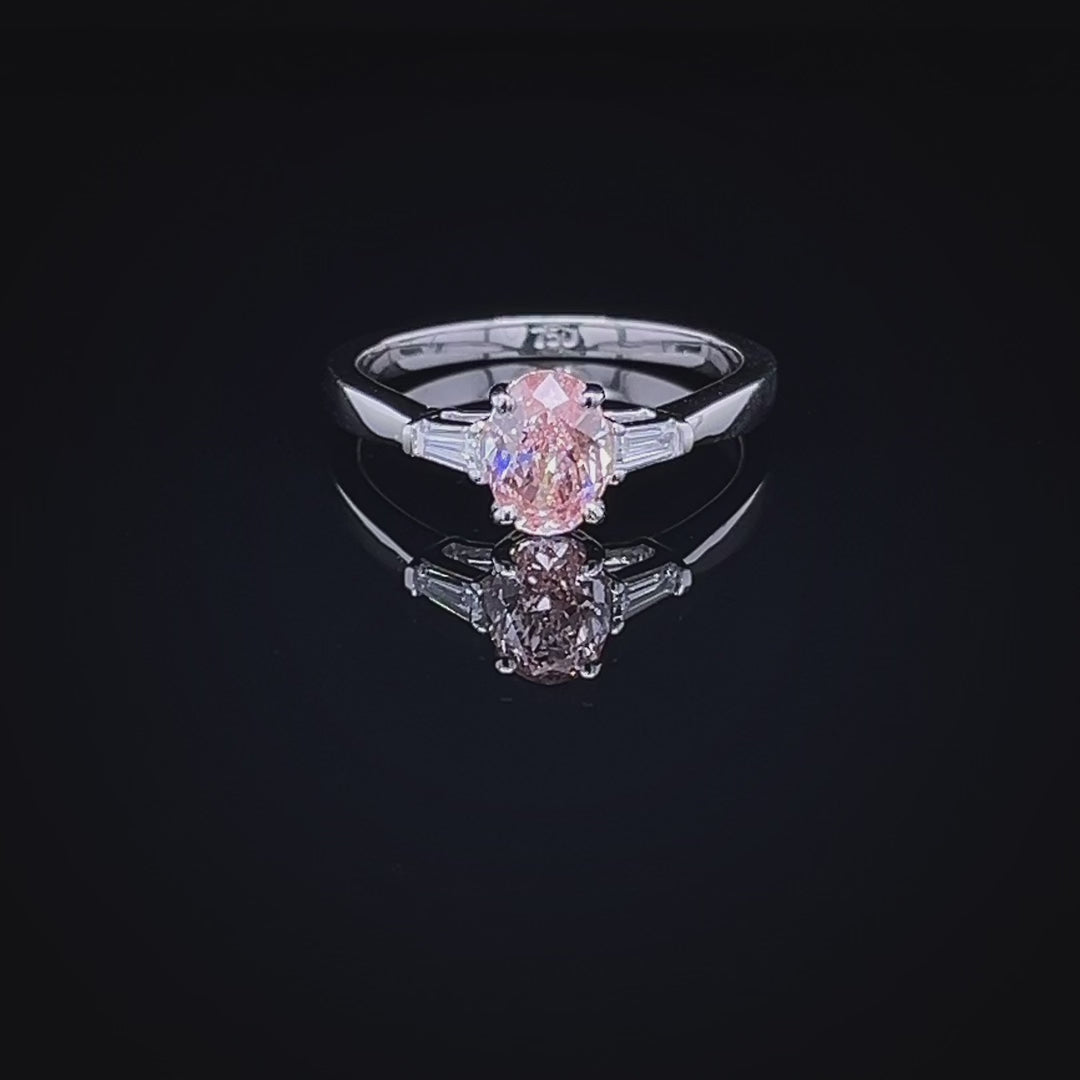 Indulge in the allure of sophistication with our Oval Pink Diamond Ring, a true testament to elegance and style. This ring features a mesmerizing 0.99-carat oval pink diamond, renowned for its rare and captivating hue. Flanked by sleek baguette diamonds, this piece combines modern design with timeless beauty, creating a stunning visual effect.