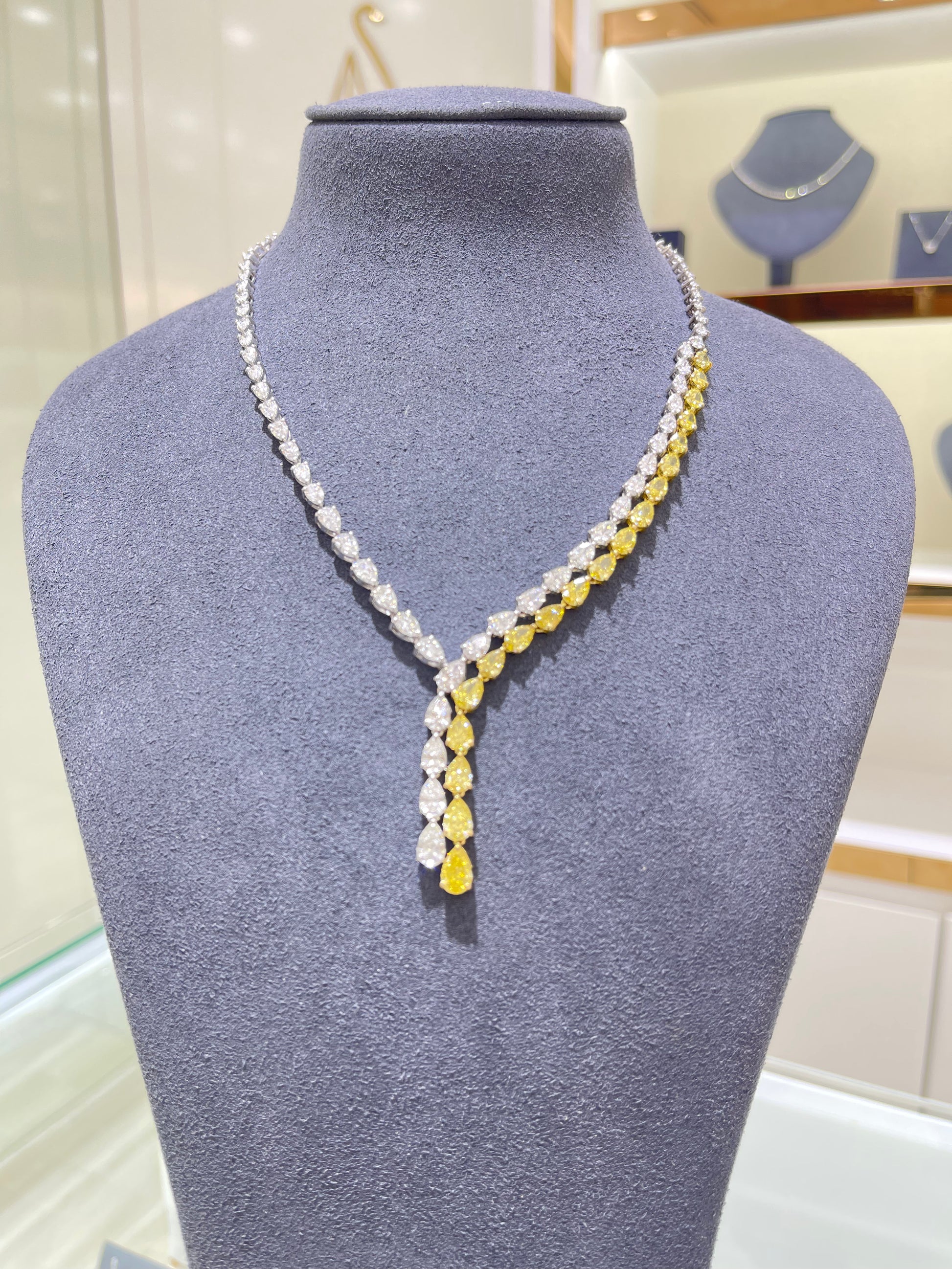 This exquisite pear-cut fancy yellow diamond necklace showcases a vibrant, rare gemstone expertly set to highlight its unique color and brilliance. Designed for connoisseurs of fine jewelry, it combines sophisticated craftsmanship with a striking, elegant silhouette, making it an exceptional statement piece for any distinguished collection.